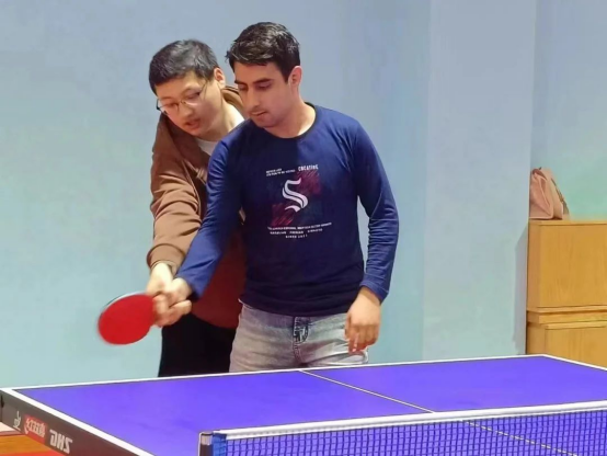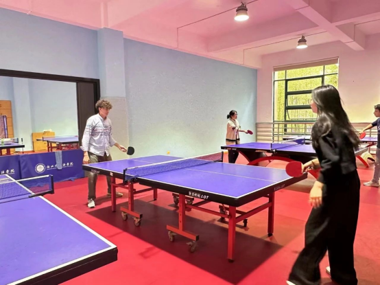这是我第三次参加英院“跨文化交际时光”活动,与以往单纯交谈不同的是加入了运动的元素,刚好我会乒乓球,和职工“切磋”了一下下,他是第一次接触乒乓球,对规则有点不太熟悉,但真的打得很好,我提醒他发球后要先碰到自己的桌子,再越过网,如果对方的球打过来没有碰到桌子就可以不用接了等等,最后活动在大合照中结束,我非常享受这种别致的活动形式,希望以后还有机会参与!
