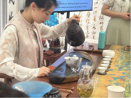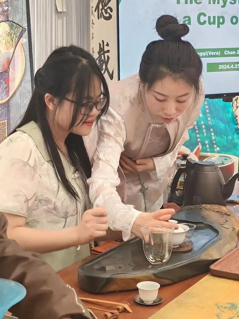 随后张星琪引导大家进入了品茶泡茶环节。本次活动邀请了一名神秘嘉宾——秦国华老师为大家现场演示泡茶的流程:温杯—投茶—洗茶—泡茶—出汤—分茶。一举一动,尽显东方神韵,同学们摈除喧闹,认真观摩着老师的一举一动。泡茶结束后,主持人和主讲人针对茶品介绍和泡茶环节进行小提问,以热茶为礼,热闹现场。不管是职工还是中国员工,纷纷举手,分享“切磋”刚刚所学的茶文化。