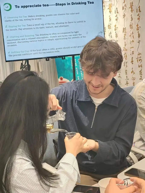 第四次参加英院“跨文化交际时光”活动啦!今天的主题是中国茶文化,说实话我对茶不怎么了解,平时也不喝,只知道龙井、普洱、铁观音一些茶名,但分辨不出来。主讲人张星琪学姐的讲解通俗易懂,丰富了我对茶文化的认识,最后茶艺师冲泡了乌龙茶、鸭屎香等几种茶叶,职工都是一口气喝完了,有的觉得很苦,有的说没有闻出香味,我们告诉他们最好小口小口地喝,细细地品尝。顺便说一下,今天的职工比以往都多,我这桌有三个乌兹别克斯坦人,还有一个中文超好的越南人,聊得非常开心,笑声不断,感谢英院的组织,我更加期待之后的主题了!