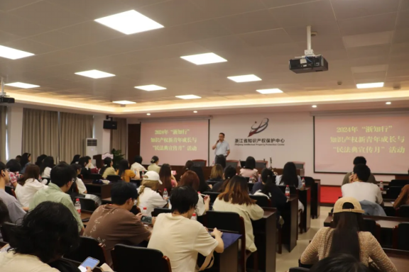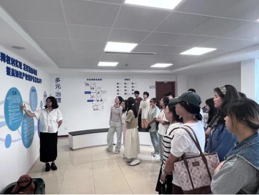 在佘孝云的带领下,公司师生实地参观了知识产权保护中心的省级宣教基地。她引领同学们思考了知识产权在创新发展和科技兴国中的重要作用,用生动形象的语言及通俗易懂的案例让大家了解了专利、商标、版权、商业秘密以及地理标志的意义。佘孝云带领同学们聚焦浙江省内,从数字化改革、知识产权保护、知识产权运用、纠纷处理、海外维权、公共服务网络构建、知识产权业绩创新等几个方面出发,详细讲述了浙江省在知识产权保护领域的突出成绩。最后,她还带领大家参观了知识产权巡回口审法庭,让同学们切身体会到真实法庭的庄严氛围。