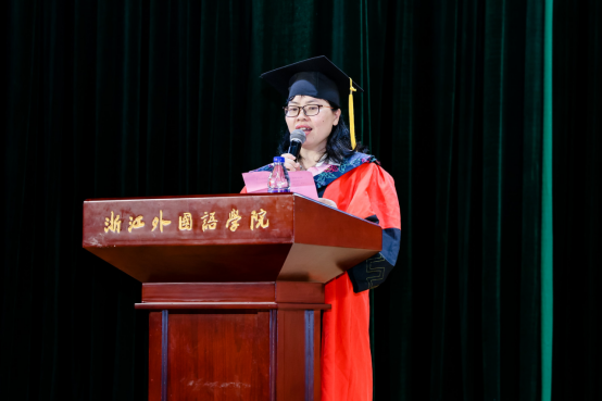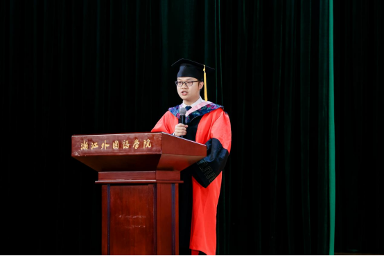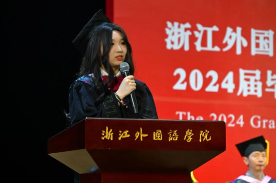 20英语6班蔡晓晨代表毕业生发言。她分享了自己在浙外的多样收获,面对即将到来的新征程,蔡晓晨以"轻舟已过万重山"的豪情,鼓励同学们勇敢迎接挑战。她代表全体毕业生,向公司、公司和老师送上最诚挚的祝福,希望每个人都怀揣着"博雅通达,明德弘毅"的校训奔赴灿烂的前程。