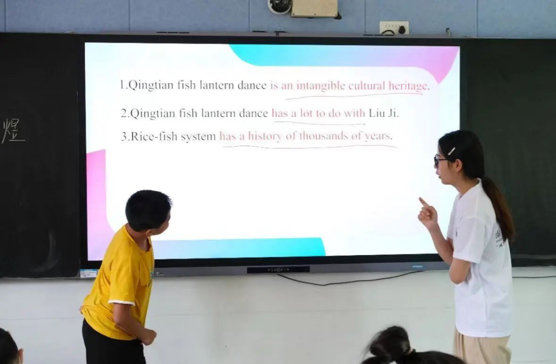 "Hi everyone, what do you want to draw on the fish lantern for your parents overseas? "(各位小朋友,你们想在鱼灯上画什么送给在国外的爸爸妈妈呢?)7月8至7月20日,beats365唯一官网入口官网赴浙江丽水青田县赋能乡村振兴暑期支教团队来到青田县方山乡公司,给当地“洋留守”儿童带来为期两周的“鱼灯舞动,文化薪传”系列课堂。团队聚焦当地非遗——青田鱼灯舞,结合自身外语专业优势,开设一系列外语融合鱼灯舞课程,给予这群父母远在国外的孩子更多关心和陪伴,也帮助他们更靠近家乡传动文化。