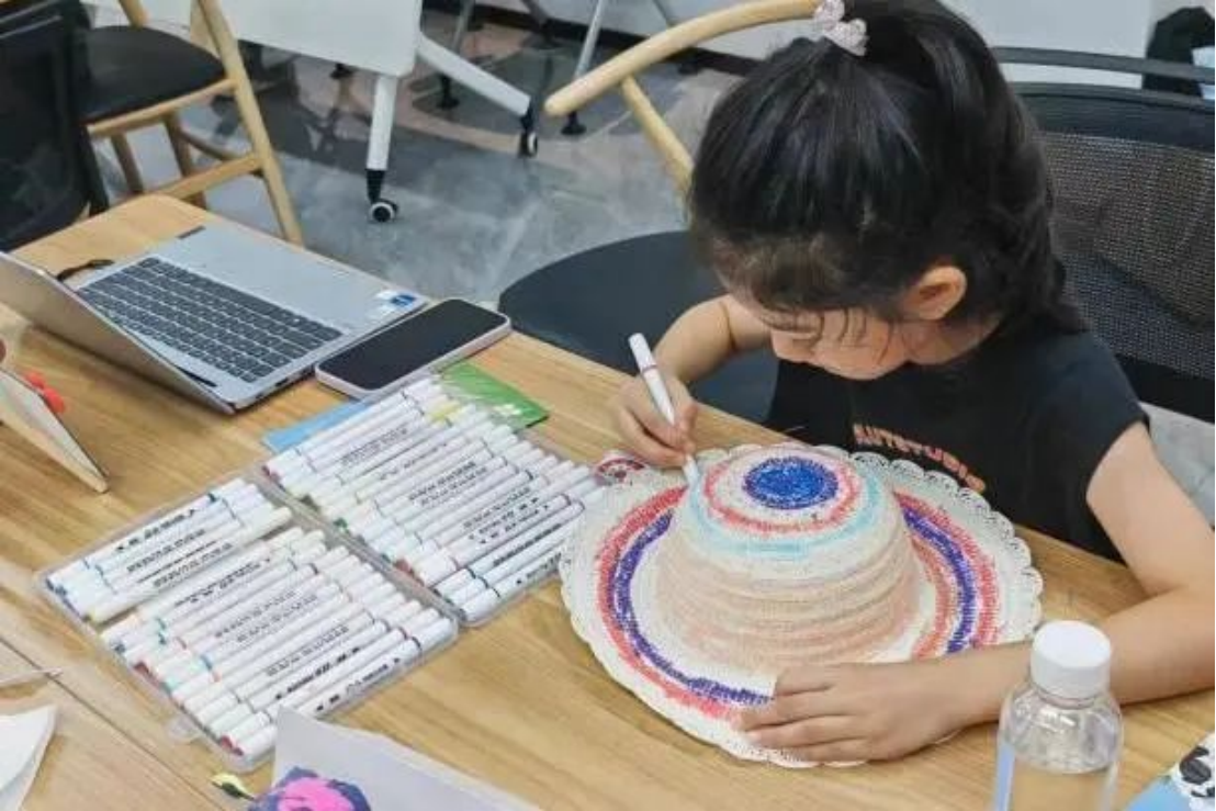 “老师,我想做龙形状的泥泥狗,你可以帮我画一下形状吗?”“老师,有什么代表芒种的植物吗?我想画在帽子上!”“老师,我还需要白色的颜料!”童声稚嫩,童心绘梦,每一抹色彩都是对未来的憧憬和对美好世界的向往。