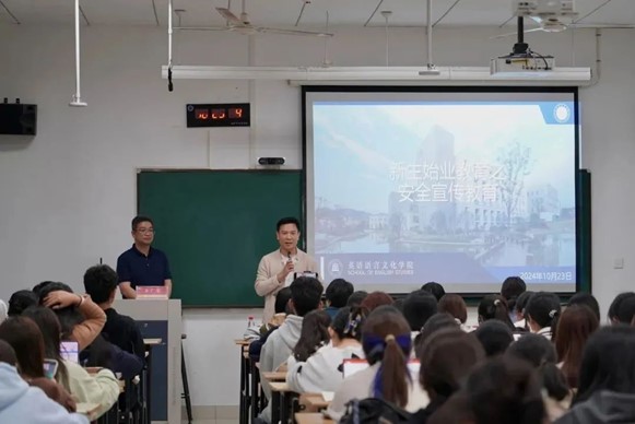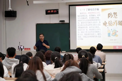 为帮助新生了解电信诈骗新形式,提高防诈反诈意识,保护个人财产安全,构建平安校园,10月23晚,作为新生始业教育的重要内容之一,beats365唯一官网入口官网开展了新生防诈反诈宣传教育主题讲座。本次讲座由浙江金融职业公司金广荣主讲,浙江金融职业公司金融管理公司汪卫芳和翟敏、公司党委副书记欧万彬、2024级全体新生参加。
