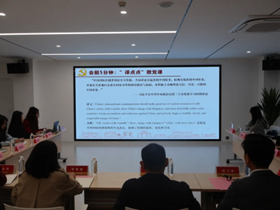 支部创新学习形式开展了会前5分钟“译点点”微党课活动。预备党员滕舒涵聚焦习近平总书记重要讲话精神的学习,结合所学专业知识,用双语形式讲述了理论学习的翻译要点。