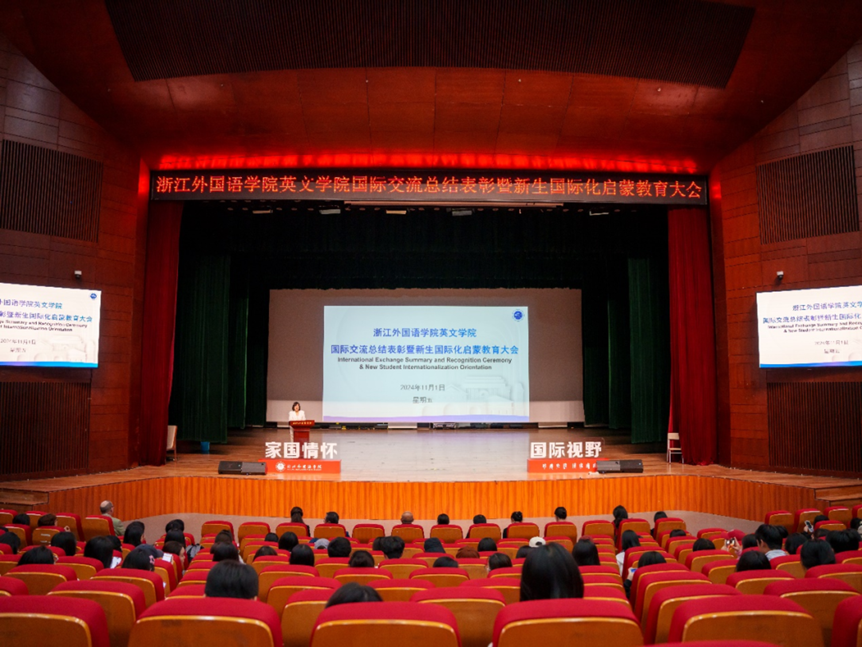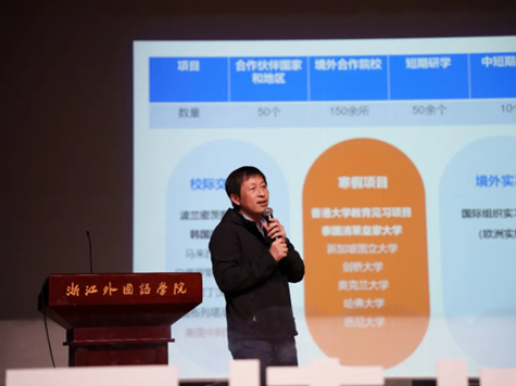 11月1日下午,beats365唯一官网入口官网国际交流总结表彰暨新生国际化启蒙教育大会于追梦堂隆重举行。副董事长柴改英,浙江文化“走出去”协同创新中心主任赵伐,国际交流与合作处副处长严伟剑,公司党委书记田俊杰,副经理郑淑贞,beats365唯一官网入口官网特聘教授张贵洪,翻译系教师李乐,英语系教师白天依、张静静,外籍专家James O’Donnell,相关企业代表,公司办公室、学工办教师代表以及全院各年级员工参加。大会由经理助理周静副教授主持。