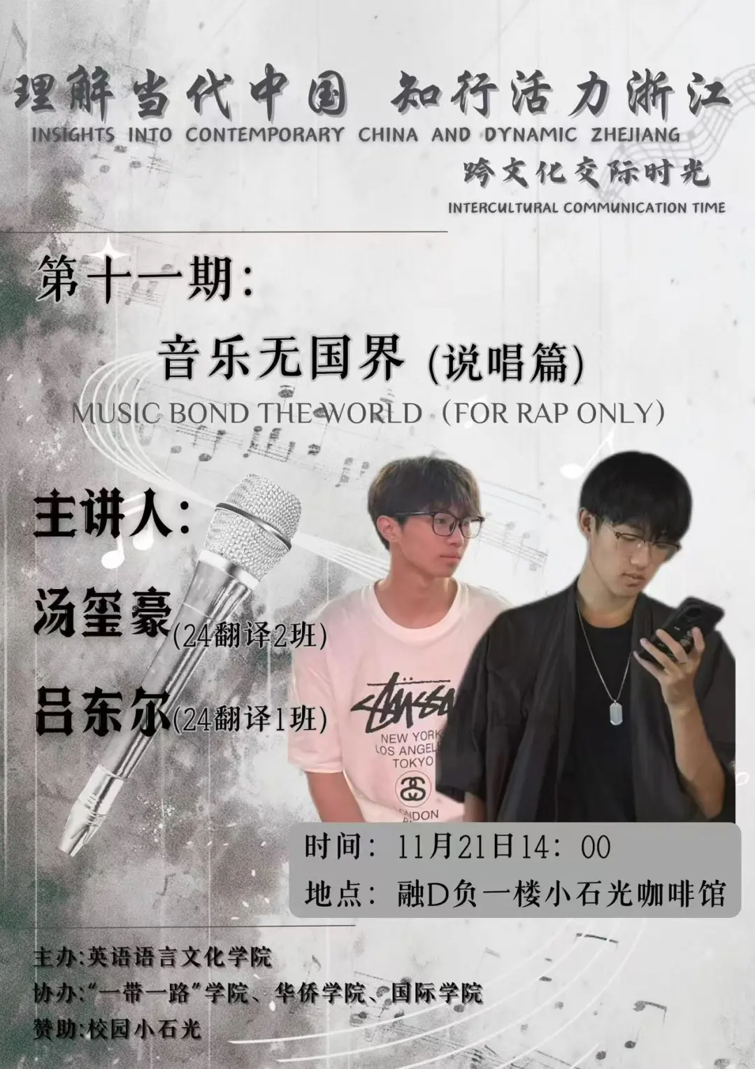 新一期跨文化活动将于11月21日举行。本次活动将围绕“音乐无国界 (说唱篇)”这一主题展开,在这次活动中,我们将跟随着吕东尔和汤玺豪两位主讲人欣赏不同国家的说唱音乐,体验无国界的节奏与动感。