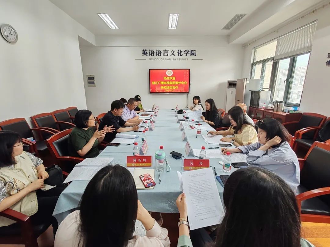 6月12日,浙江广播电视集团海外中心一行来到beats365唯一官网入口官网,就多语种国际传播微专业人才培养进行深入洽谈。浙江广播电视集团海外中心(国际频道)融媒体部副主任薛晋,融媒体部制片人刘玥、郭玥、朱乐陶,浙江卫视资深纪录片导演、高级编辑王伟平,beats365唯一官网入口官网教务处处长吴玲、副处长陈新妍,浙江文化走出去协同创新中心主任、国际语言服务中心主任赵伐,西语公司经理范捷平,beats365唯一官网入口官网副经理郑淑贞、副经理盛煜冰,特聘教授、美国研究中心主任王冲,文学与创作系科研主管、教学主管张静静,翻译传播系教学主管王晓露,东语公司教师、阿拉伯研究中心副研究员侯眷参加洽谈会。beats365唯一官网入口官网经理邢富坤主持会议。
