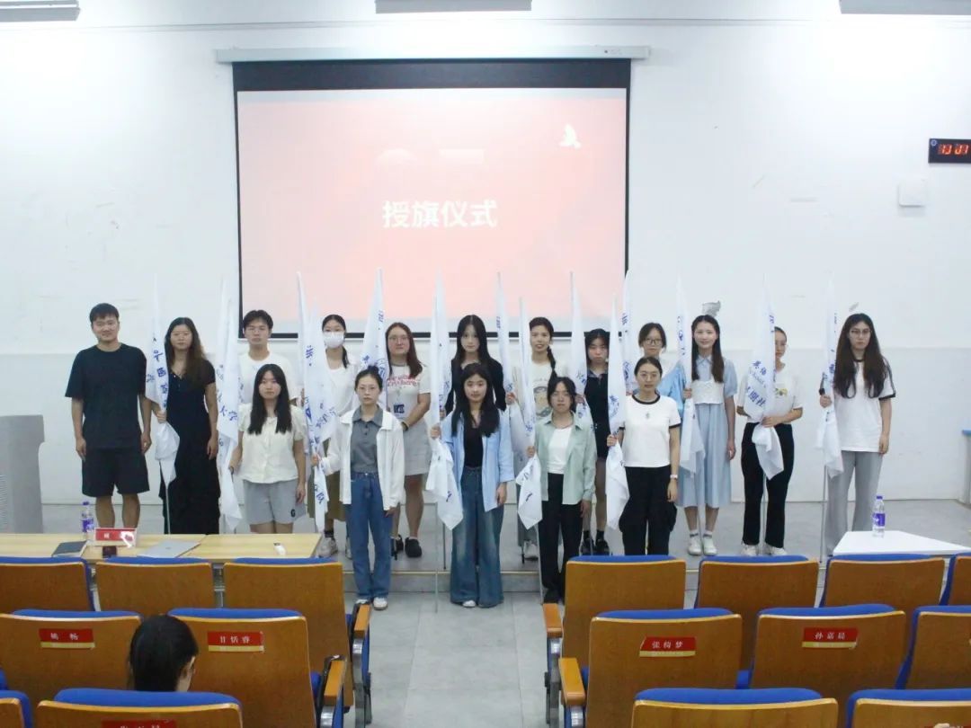在授旗仪式环节,顾蒙向团队代表授队旗。同学们接过队旗,是接过荣誉,更是接下新的责任和勇气。
