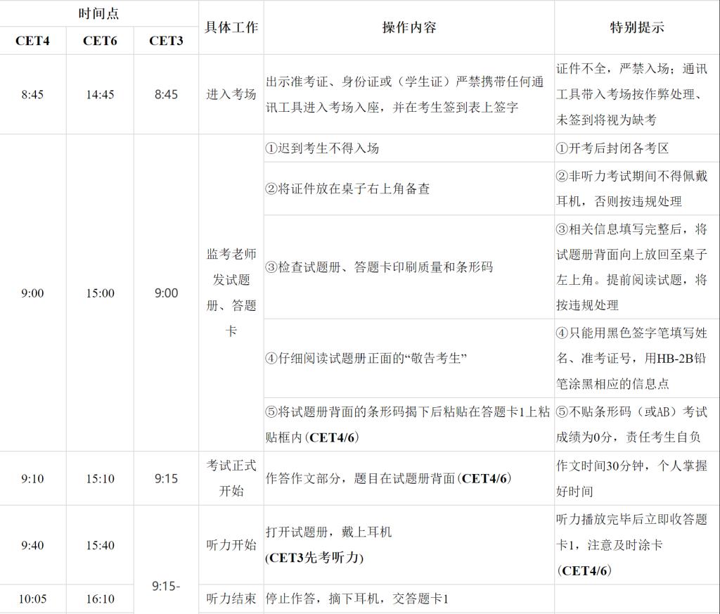 2.▲CET4在9时,CET6在15时,监考员将试题册与答题卡1、答题卡2一同下发后,考生除按要求填写(涂)答题卡1和答题卡2上相关内容外,须将试题册背面上的条形码揭下后粘贴在答题卡1的条形码粘贴框内,并在试题册指定位置填写姓名和准考证号。完成后,考生须将试题册背面向上放回至桌子左上角,不得提前翻阅试题册,违者按违纪处理。