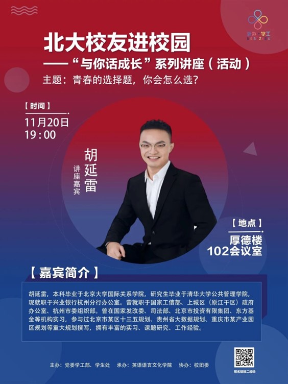 我们将定期邀请北大优秀员工来校与同学们面对面作交流,通过讲座或访谈等多种形式,结合他们在北大学习生活的所见所闻所思和成长经历,与浙外学子们一起分享成长的故事、感悟和经验。