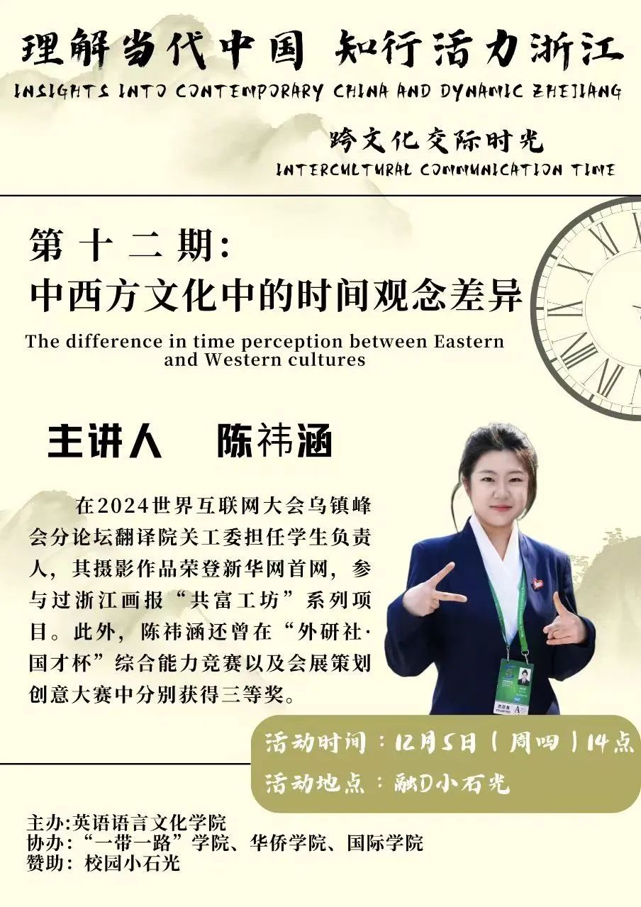 新一期的跨文化交际活动将于12月5日举行,届时我们将聚焦“中西方文化中的时间观念差异”这一主题。在主讲人陈祎涵的引导下,我们将揭开中西方时间观念差异的神秘面纱,这不仅是一场文化的探索之旅,也是一次思想的碰撞,期待你的参与!