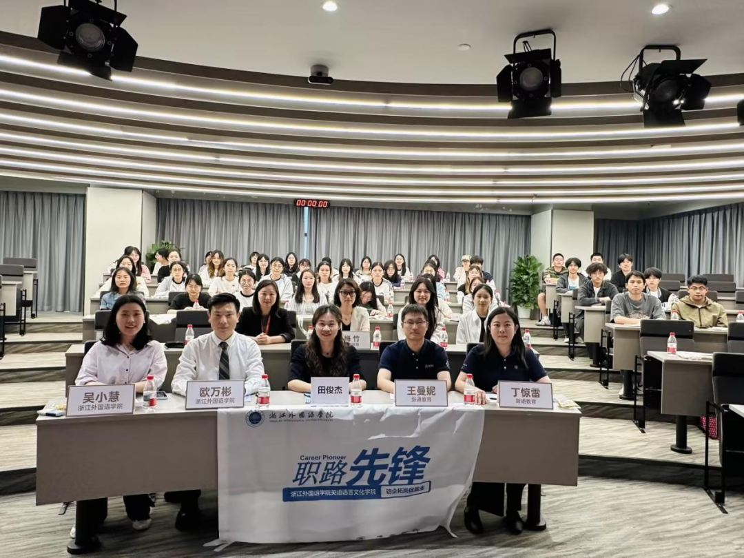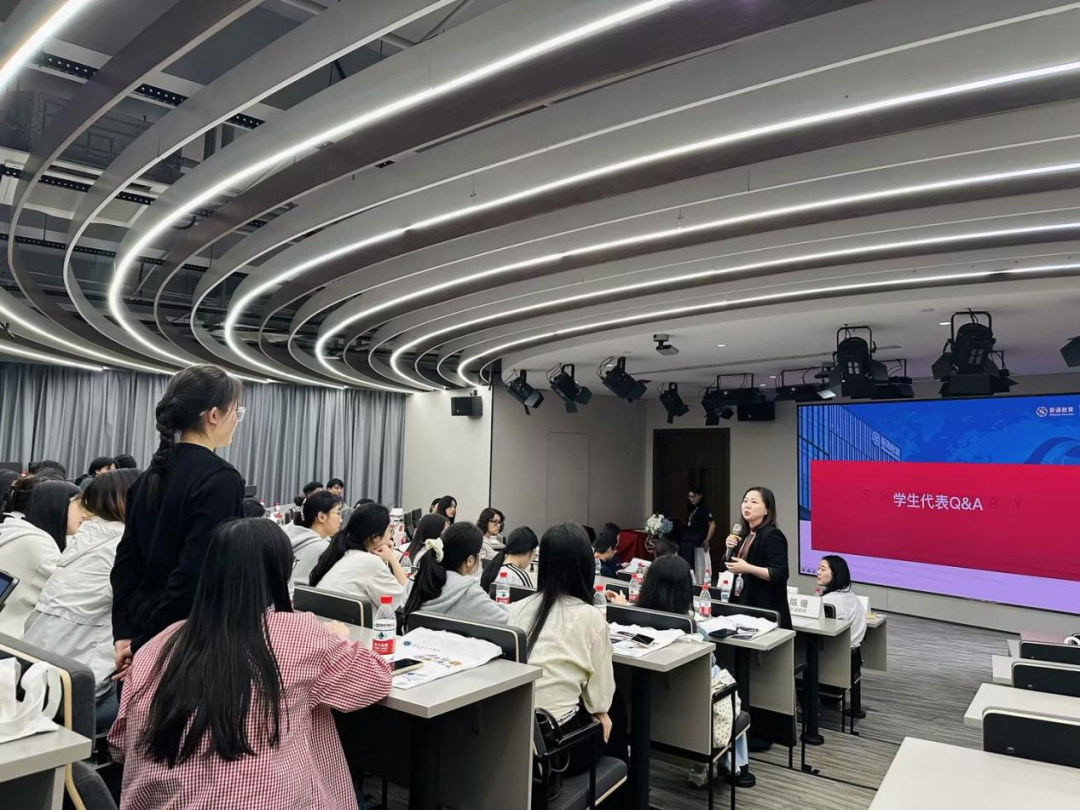 在Q&A环节,员工特别关注除了教师之外的职业发展路径,新通外语公司人事总监陈鸿雁详细介绍了公司提供的多元化岗位选择,包括课程顾问、留学规划师、市场运营、国际项目协调等职位,为不同专业背景的同学拓宽了职业选择。这些分享让同学们认识到,语言专业学子有丰富多样的职业发展可能。